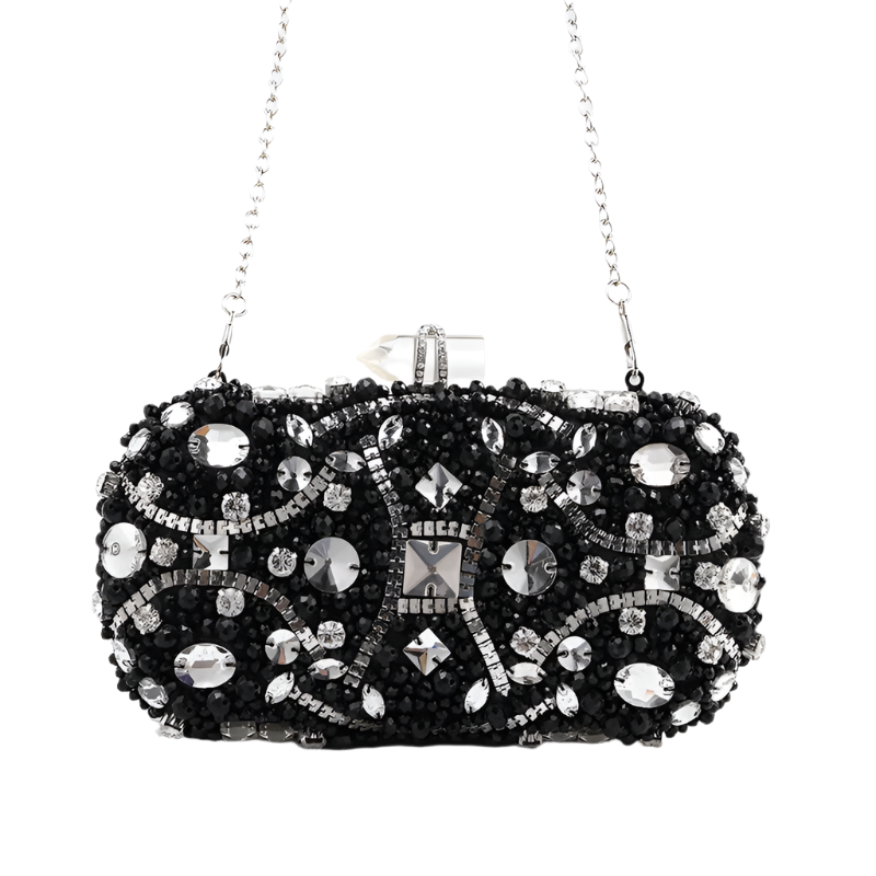 - Turn heads and be the center of attention with this eye-catching rhinestone clutch.
